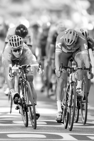 7月18日,斯洛伐克选手萨甘(左)在终点线冲刺并超过挪威车手克里斯托弗。萨甘以4小时26分02秒的成绩获得赛段冠军。