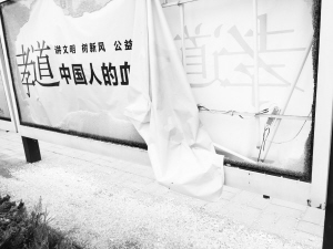 7月21日,在周口中心城区交通大道,一公交车站台上的公益广告玻璃碎了一地,里面的广告喷绘也被人扯了下来。附近市民表示,公益广告是城市的一张崭新名片,在大家都在为创建省级文明城市而努力时,这种破坏公共施设的行为损害了公众利益,破坏了城市形象。晚报记者 王凯 摄