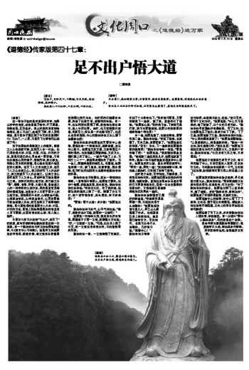 这一章老子说的是求道而非求学,如果从求学的角度,应该是读万卷书,行万里路,走得愈远,见识愈多。但从求道的角度却恰恰相反,道人不出门,全知天下事,有人开玩笑说,是不是老子预见到了今天的互联网时代?不出门,一上网,不是天下大事都可以知道了吗?