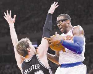 图为2013年1月3日,尼克斯队球员斯塔德迈尔(右)在2012-2013赛季NBA常规赛与圣安东尼奥马刺队的比赛中进攻受阻。