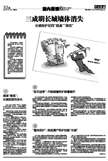 “如此大体量的长城仅依靠现有的少数文物工作者和少量的长城保护员来保护是不可能的。”成大林说,保护条例的落实还是需要具备可操作性的实施细则。目前对于破坏长城的行为是发现一起举报一起,然后再协调稽查队,等执法人员到现场后,文物可能已经被破坏了。