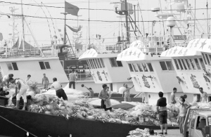 7月30日,在江苏省连云港市赣榆区青口中心渔港,渔民在往渔船上搬运网具。