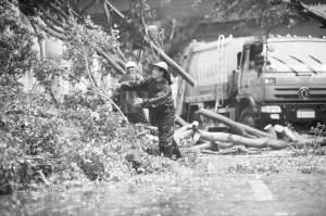 8月2日,深圳市园林绿化工人在深圳市滨河大道处理毁坏的大树。