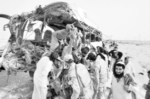 8月2日,在巴基斯坦南部信德省贾姆舒鲁地区的一条公路上,巴基斯坦士兵处理车祸现场。
