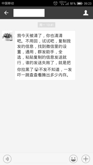 “不要让拉黑你的人占用你的空间,你也试试吧,复制我的消息,找到微信里的设置,通用,群发助手,全选,粘贴发送就行,谁的发送失败了,就是把你拉黑了。不发不知道,一发吓一跳,查查看腾出多少内存。”微信收到类似的消息,如果你转发了,那你就上当了。“转发出去才知道被骗了,不但没有清理空间,还收到很多朋友的回信,说我‘上当了’,真是气人。”周口微信用户王女士说。