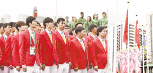 上午9时许,百余名身着红、黄色礼仪服装的中国代表团将士们,列队等候升旗仪式举行。