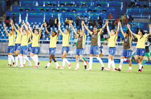 当谭茹殷第33分钟在球门线上挡出克里斯蒂亚内的射门时,中国队的城门已是危如累卵。三分钟后,巴西队在禁区混战中打破僵局:赵丽娜起跳没能抓住玛塔主罚的任意球,王珊珊将球勉强顶了一下,埋伏在点球点附近的莫妮卡头球甩在右侧门柱内侧弹进球门。0∶1,“铿锵玫瑰”落后。