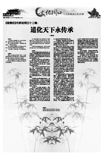 本章老子阐述的是修身治国之道。老子指出,治国者要把自己看作是百姓供养的孤寡者,要把百姓当作自己的衣食父母,奉行大道的无为施益精神,尽自己所能为百姓奉献一切。