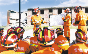 8月7日,青海省公安消防总队消防战士在演练现场布置救援方案。