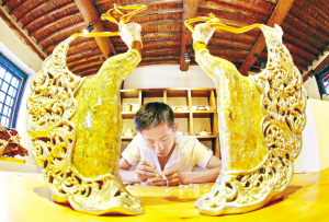 8月8日,北戴河村“闲栖舍”工作室的工作人员在雕刻银饰品。