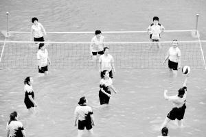 8月9日,在湖北省恩施土家族苗族自治州宣恩县城区贡水河上,选手们参加“水上排球”比赛。