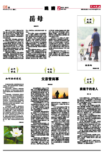 住处门前有一棵老槐树,岳母经常把树下扫得干干净净,放上几把椅子,成为一个众人聊天休闲的好去处。经常有人有事没事来到这里,谈天说地,说古道今,岳母从不会让自己置身事外做一个旁观者,话题无论涉及天文地理、古今中外、民间历史、社会政治,她都能参与其中,发表自己的看法,每天看电视,听新闻,与时代同步,思想从来也不会落伍。