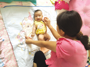 周口晚报记者看到,月嫂给宝宝做按摩时,宝宝十分配合,且一副很享受的表情。