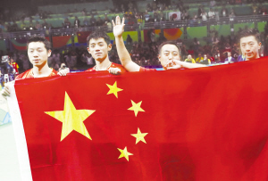 当地时间8月17日,中国队庆祝胜利。当日,在2016年里约奥运会乒乓球男子团体赛决赛中,中国队以3:1战胜日本队夺得金牌,成就三连冠。自北京奥运会团体取代双打成为乒乓球比赛项目以来,这是国乒继2008年和2012年之后连续第三次包揽奥运会单打和团体四枚金牌。