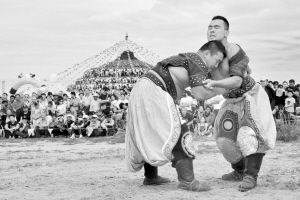 8月18日,在内蒙古乌拉特中旗海流图镇,两名选手在进行摔跤比赛当日,内蒙古巴彦淖尔市乌拉特中旗海流图镇举行一年一度的祭敖包活动,以祈求草原风调雨顺、平安吉祥。祭祀活动同时还举行了搏克、射箭、赛马等传统竞技活动。