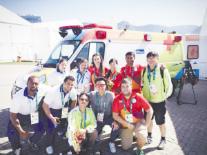 在里约奥运村运动员训练区,陈滕与同伴负责6个场馆30个大小项目的医疗急救护理转运、医疗站外语交流、协助搬运患者、协助录入场馆内所有医疗服务信息等工作。
