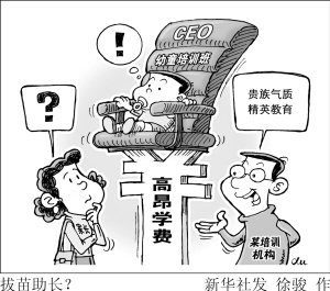 “培养3至8岁孩子未来领导力,使其具备领导者必备的领导力和竞争力。”在广州市东风路的一家培训机构外墙上贴出了这样的标语。工作人员介绍说,该机构招收3至12岁的儿童,课程包括“培养CEO”气质等在内的多项“开发类”课程。一周1至2次课程,每年学费5万元。