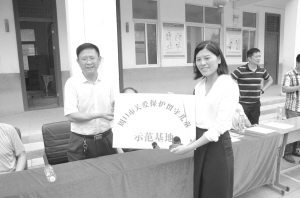 当日9时许,周口晚报记者在李灵希望小学院内看到,市民政局相关负责人将“周口市关爱保护留守儿童示范基地”牌匾授予校长李灵(如图)。授牌仪式后,来自市民政局、市慈善总会和周口耳喉鼻医院、周口华夏职业培训中心两家爱心企业的志愿者,将他们准备好的书包和文具盒送到现场50余名留守儿童手中。紧接着,两家爱心企业的志愿者还为50名留守儿童进行了健康检查和心理辅导讲座。