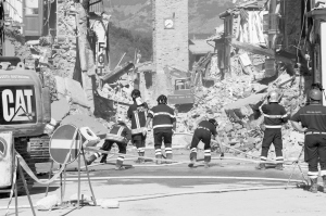 8月28日,在意大利阿斯科利皮切诺,消防员在地震废墟旁工作。
