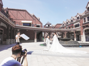 秋高气爽天空蓝,一年中最适合拍婚纱的季节来到了,我市一些著名大型婚纱摄影实景基地也热闹起来。图为8月30日上午,一对来自郸城县的情侣在周口碧桂园兰蔻实景摄影基地拍摄婚纱。该基地相关负责人告诉记者,天气转凉之后,来自周边县市前来拍婚纱的新人明显增多,周末最多时一天就有30多对。
