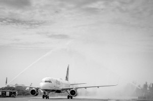 8月31日,来自美国的商业直航班机在古巴中部的圣克拉拉市国际机场接受“水门洗礼”。