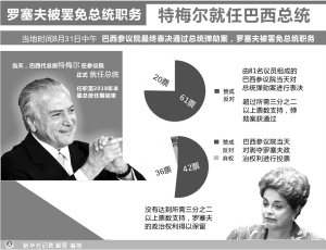 巴西参议院8月31日最终表决通过总统弹劾案,罗塞夫被罢免总统职务,代总统特梅尔正式成为总统。