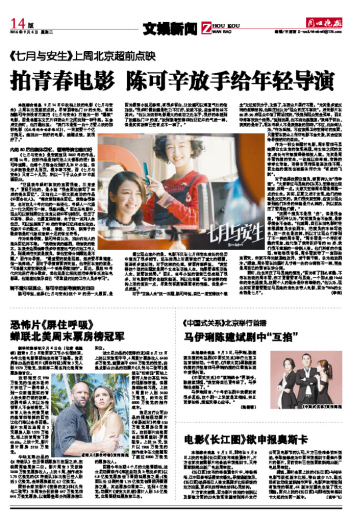 本报综合消息 9月14日中秋档上映的电影《七月与安生》上周在北京超前点映。尽管顶着热门IP的头衔,但监制陈可辛并没有打算把《七月与安生》打造为一部“爆款”电影,而是希望在文艺片和商业片之间找到一种平衡。在会后交流时,他打趣地说:“我们不是张一白十月要上映的那部电影(《从你的全世界路过》),一来就要十个亿才满足。能拍出一部好的电影,能赚点钱,就很好了。”