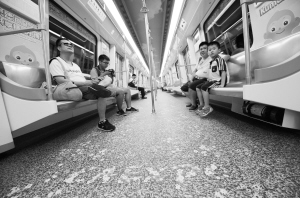 9月5日,人们乘坐东博会主题地铁列车出行。