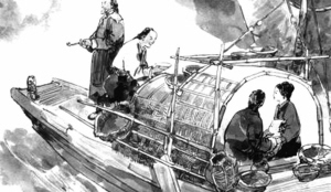 船帆的作用很大。船民常说“船使八面风”,除顶风外,其他方向的风力都可借用,这就是船帆的功劳,它就像个马达能省不少人力。大的船帆有100多平方米,小的也有七八十平方米。船帆使用的是最厚最耐用的白布,这种布主要用于船帆,所以叫“帆布”。船帆上面横着固定一些大竹竿,很像一根根肋骨,再将竹竿系在桅杆顶部的滑轮上,用绳拉着船帆,使船帆升降自如。由于船帆露天,经常受到日晒风吹雨淋 ,破损很快,必须经常修补。修补船帆,也要趁着晴天进行,把烂船帆卸下来,抬到岸上摊开,大家坐在船帆上修补。船帆如果破损小,一天即可完成,如果破损大两三天才能完成。对船民来说,这也是一项大的开支。