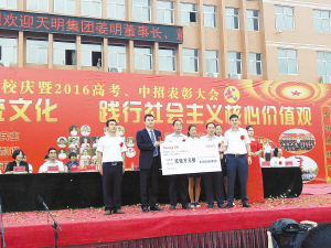 据悉,周口文昌中学“弘文天明班”的学生每人每年将获2000元助学款,直至在周口文昌中学完成学业。每年,周口文昌中学高考前20名的学子每人可得到1000元助学基金。