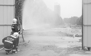 当日早上,消防官兵赶到现场后发现,破裂的天然气管道不停地喷出天然气,现场可燃气体浓度非常高,一旦发生爆炸,后果不堪设想。消防官兵迅速划定警戒区域,疏散无关群众和过往车辆,并在泄漏处上风方向设置水枪阵地,利用开花水枪对泄漏的天然气进行稀释,降低天然气浓度(如图)。在消防官兵和燃气公司技术人员的共同努力下,成功排除险情。