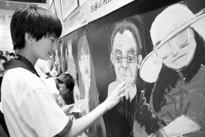 9月10日,北京五中教育集团学生在粉画墙上画出老师的形象。
