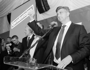 9月12日凌晨,在克罗地亚萨格勒布,克罗地亚民主共同体主席普连科夫(右一)在选举初步结果公布后发表讲话。