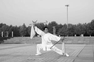 中秋节将至,周口市太极拳协会在市经济开发区人民广场举办了一场太极器械交流活动,众多拳师亮相,助兴传统佳节。图为市太极拳协会主席张建国在表演双钩。