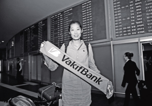 朱婷在伊斯坦布尔阿塔图尔克机场展示瓦基弗银行俱乐部的围巾。