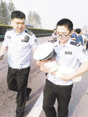 看这抱孩子的姿势,生疏得很呢!可那珍而重之的心情,从挂在鼻尖上却顾不得扶上去的眼镜就能看出来了。旁边的交警用自己的帽子给孩子挡住刺眼的阳光。这真是一张暖人的照片。——编者按