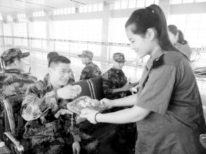 9月15日中秋节,周口火车站客运人员为当日乘坐火车的500多名新兵送上月饼和祝福。