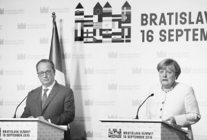 当地时间9月16日,在斯洛伐克首都布拉迪斯拉发,德国总理默克尔(右)和法国总统奥朗德在欧盟非正式峰会闭幕后联合举行记者会。为期一天的欧盟非正式峰会16日晚在斯洛伐克首都布拉迪斯拉发闭幕,与会的欧盟以及欧盟27国领导人达成为期6个月的工作路线图,在防务、移民、反恐、经济等方面提出纲领性目标及措施。