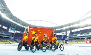 当地时间9月17日,中国选手刘成明、刘洋、李虎召和崔彦峰(由左至右)在赛后庆祝。当日,在2016年里约残奥会轮椅竞速男子4X400米接力T53/54级决赛中,中国队以3分04秒58的成绩获得冠军。