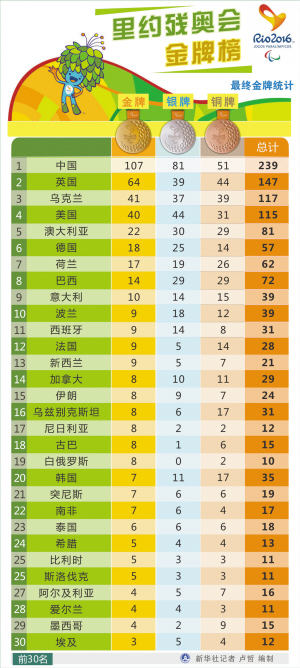 金牌榜上,英国以64金列第二,乌克兰以41金排第三。另外,有63个代表团获得了金牌,83个代表团登上了领奖台。残奥田径男子1500米T13级(视力残障)比赛,前四名成绩都比刚结束的里约奥运会该项目金牌得主快,成为残奥会的一段传奇。