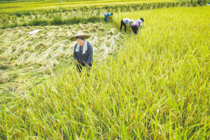 9月19日,瓮安县岚关乡郊外,当地村民在收割水稻。