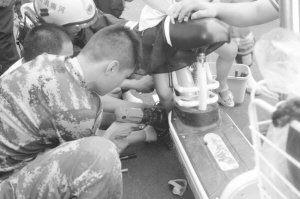 本报讯 “叔叔,快救救我吧,快救救我吧……”9月18日下午,一个小女孩坐在电动车后座,一不小心右脚被卷进车轮,被卡在电动车后轮与支架之间,无奈向川汇区消防大队求助。消防官兵用液压剪扩器对卡脚部位进行剪切(如图),很快将小女孩的右脚救出。