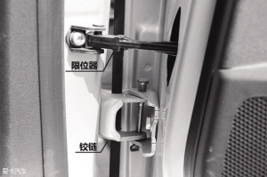 铰链起到固定作用,限位器有限制车门打开角度的作用。