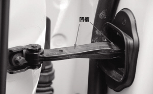 开车门,可以看到车门与车身连接处有两个零件,一个叫铰链,另一个叫限位器。铰链起到固定作用,限位器有限制车门打开角度的作用。