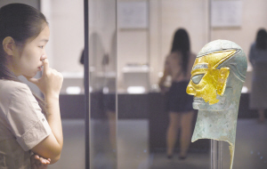 9月20日,一位女士在长沙博物馆参观出土于三星堆遗址的商代戴金面罩青铜人头像。