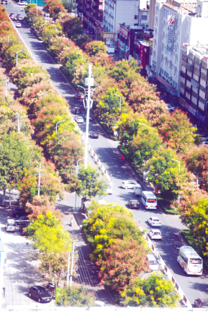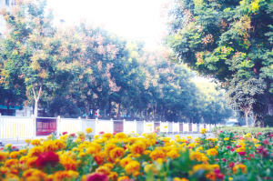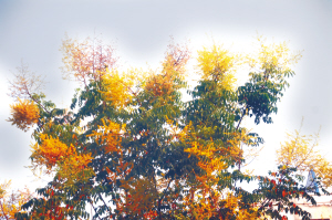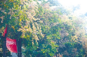 9月21日,周口晚报记者在周口市区黄河路看到,路两侧的栾树已开满灿灿的黄花,形成了一大片一大片的金色花海。在这群花海中,有的栾树已经结出串串果子,黄绿中泛红,花果共荣,组成了一幅流金溢彩的画卷。晚报记者 朱海龙 摄