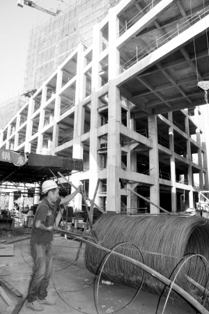 本报讯 位于市区莲花路与中州大道的万里时代广场三栋高层建筑的主体已建到10层,上边的施工面工人正忙于支模板、钢筋绑扎、混凝土浇铸,下面的施工面工人正忙着钢筋下料、平整场地,工人作业紧张有序,施工场景热火朝天。这是9月22日,记者在万里时代广场建设工地看到的劳动场景。