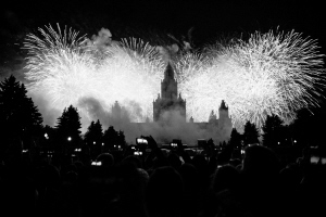 9月24日,在俄罗斯首都莫斯科,观众用手机拍摄在莫斯科大学主楼旁进行的焰火表演。