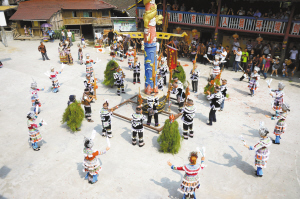 9月24日,安陲乡乌吉苗寨的村民在表演“打同年”。“打同年”是苗族村寨之间为了加强团结、密切往来、增进友谊、相互通婚而进行的芦笙比赛活动。