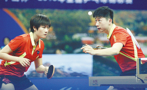 9月26日,马龙(右)/丁宁在比赛中。 当日,在辽宁鞍山举行的2016年全国乒乓球锦标赛混合双打半决赛中,北京队选手马龙/丁宁以4∶1战胜黑龙江队选手于子洋/王曼昱,晋级决赛。 新华社记者 丁洪法 摄